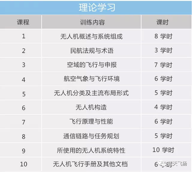 理論學習:相關民航無人機法規、無人機概述、系統組成及介紹、飛行原理與飛行性能、氣象、空域與起降場、任務規劃、旋翼無人機原理構造啟動布局、無人機駕駛員飛行手冊、空域申請與空管通訊、航線規劃、系統檢查程序、正常飛行程序指揮、應急飛行程序指揮、任務執行指揮等。
