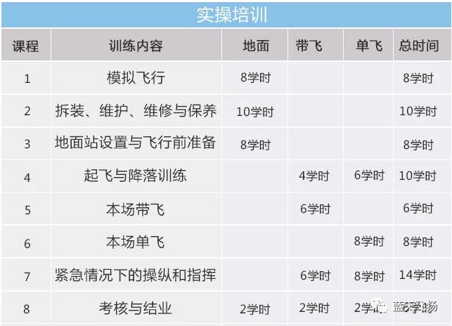 實踐飛行:模擬飛行訓練、無人機裝機調試實踐、無人機遙控裝置設置、地面站航點航線規劃應急鏈路通訊、起飛與降落訓練、四面懸停、模擬航線飛行、十字航線,矩形航線,圓周航線,定點轉彎訓練、協調轉彎訓練、水平8字,水平360度,發動機失效自旋降落處置、無人飛行器的維修及保養、充電設備和電池的使用、無人機系統安全運行管理、應急處置練習。