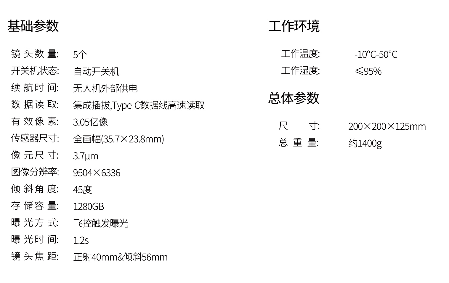 1400G機身重量,刷新旗艦級傾斜攝影相機掛載重量。CNC航空鋁合金。 保留更多的電源性能用于提升航飛面積。