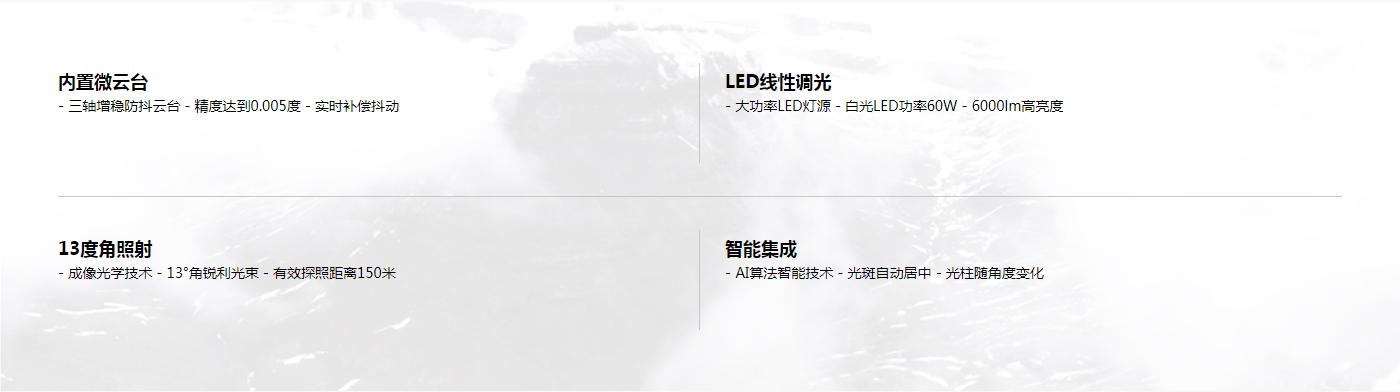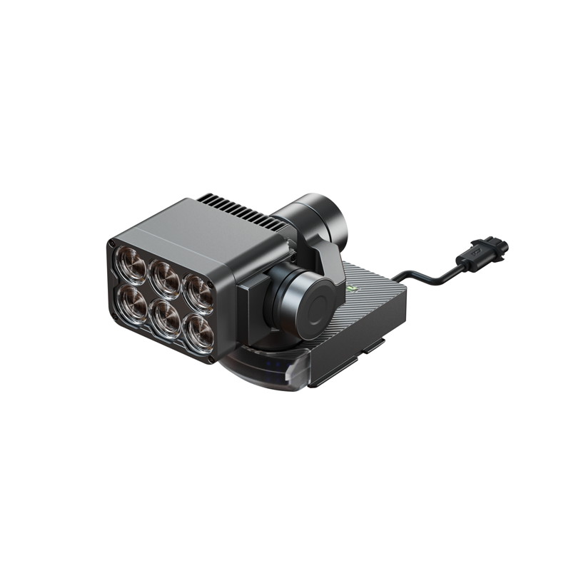 成至GL60 mini三軸云臺探照燈,僅重240g,卻能提供6000lm的中心亮度,額定功率70W,可發射13°角的銳利光束,有效探照距離可達150米,為無人機夜間作業帶來更靈巧便捷的照明體驗;GL60 mini集成AI算法智能技術,光斑在相機畫面可實現自動居中,做到光柱真正如影隨形;通過DJI SkyPort V2.0接口,可完美適配DJI經緯M30行業無人機,滿足夜晚巡查、警告驅離、電力巡線、搜索救援等夜間作業需求。