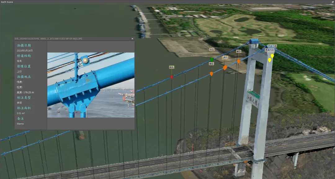 數據采集后,工作人員將巡檢素材導入數據庫,利用軟件進行缺陷標注,最后結合實景模型,直觀、精準、快速地定位橋梁缺陷部位,及時報告潛在的隱患,確保橋梁的安全運行。