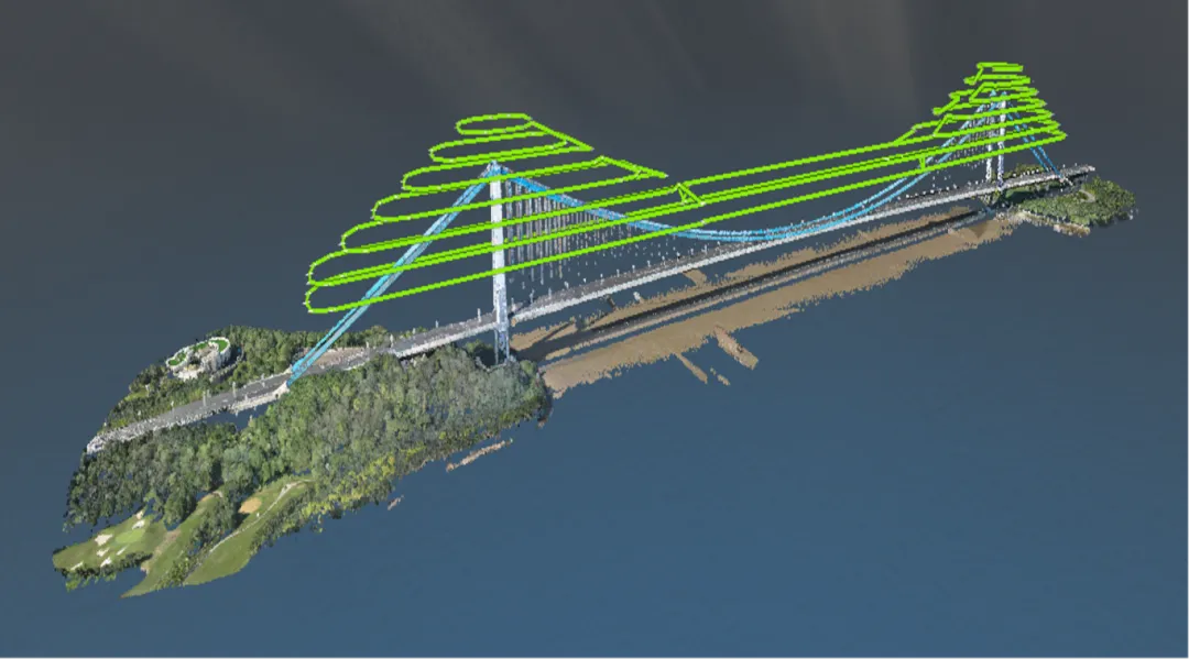 工作人員規劃帶狀航線任務,利用 M350 RTK 搭載 L2 激光雷達,對橋梁主體結構進行掃描,獲取橋梁的點云粗模。基于粗模,工作人員通過航線規劃軟件,規劃距離橋梁外包絡相對距離 30 米的航線任務,采集精細化點云數據。