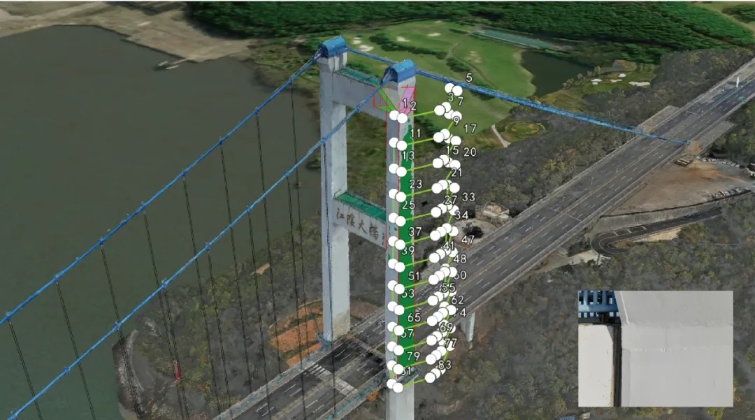 在相對距離 15 米、變焦倍數 5 倍的情況下,按照到點懸停的飛行模式,使用 H30 對懸索橋梁的索夾進行單角度巡檢作業,無人機 1 個架次可完成 75 個索夾的數據采集工作。