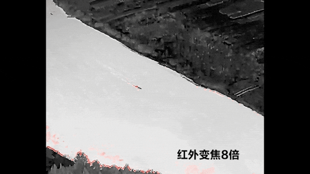夜間視線不佳,且薄霧較多,能見度較差,執(zhí)法人員切換為熱成像鏡頭進行觀察。禪思 H30T 熱成像相機分辨率高,即使在無人機飛行高度達到 400 米、距離目標物為 1200 米的情況下,依然能清晰觀測到漁船的運動軌跡和船用馬達形成的水紋,幫助執(zhí)法人員快速發(fā)現(xiàn)并精準定位可疑情況。