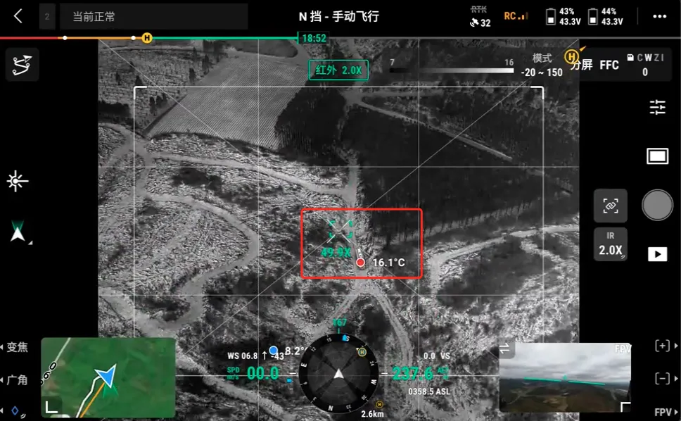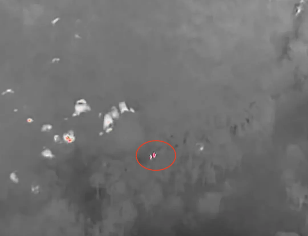 經(jīng)過 20 多分鐘的搜索,熱成像鏡頭下出現(xiàn)了異常熱源,現(xiàn)場疑似有煙點。救援隊立即通過變焦相機查看細節(jié),確認該溫度點走失男子,煙點為該男子點燃的狼煙。