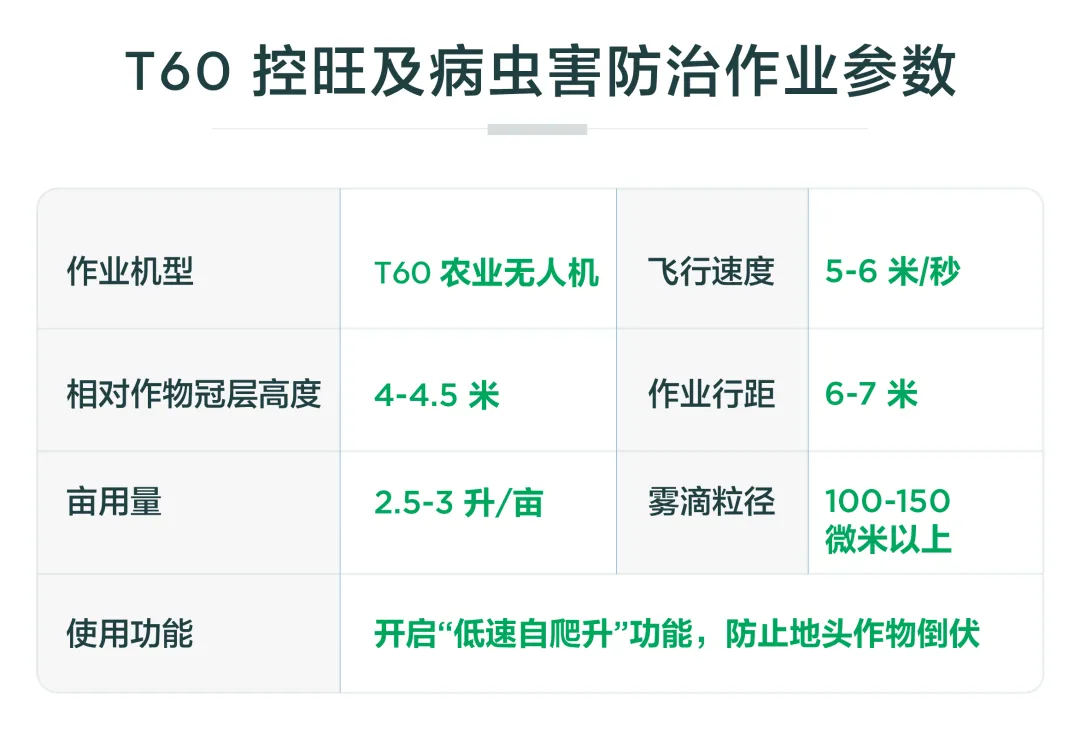 玉米大喇叭口期是從拔節到抽雄所經歷的時期,一般把玉米 7~8 片葉時稱為小喇叭口期,10~12 片葉時稱為大喇叭口期,其中 8~12 片葉時期可選擇矮壯素、乙烯利、縮節胺、多效唑等藥劑對玉米進行控旺,合理控旺能促進玉米莖稈增粗、提高抗倒伏能力。采用農業無人機控旺應確保藥劑濃度適宜,同時避免重噴、漏噴、霧滴發生飄移而導致作物長勢不均等,還應選擇在 2 級風以內作業。